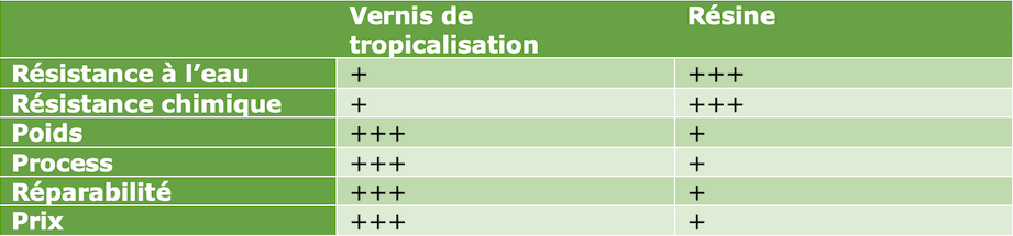 Une résine peut permettre à vos PCBA d’être protégés contre la pluie et/ ou des immersions prolongées. Voici un tableau récapitulatif qui peut vous aider dans le choix entre un vernis de tropicalisation ou une résine.