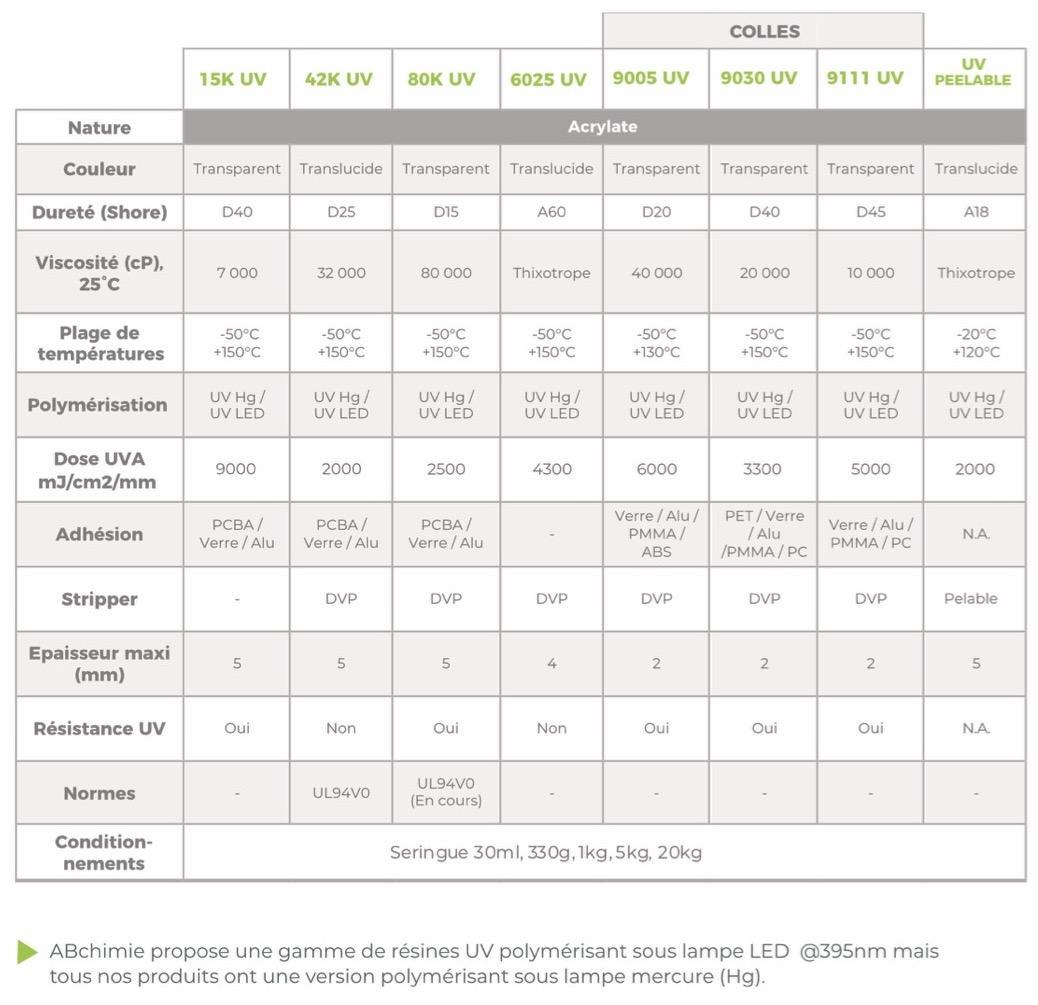 Les résines UV et colles UV de la gamme ABchimie ont été spécialement formulées pour assurer la protection optimale de vos sous-ensembles électroniques mais également pour répondre à des problématiques variées.