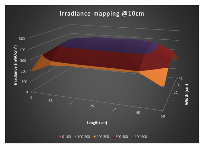 The spectrum of a UV LED system is often very narrow (for example, a main peak at 395nm plus or minus 10nm), often in UVA. These are the least dangerous UV, but because of their power, they do remain dangerous. There is no creation of ozone because there is no presence of UVC. The heat stress emitted is also less important because there is no IR emitted by this type of UV LED system.
