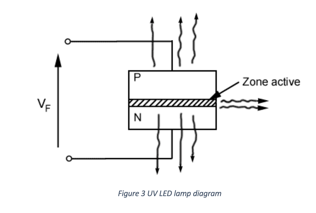 The operating principle is the following: a current pass through the semiconductor materials. The electrons passing from one junction (N and P) to another, will lose energy which will create a photon (active zone) and thus emit light. For this technology, it is the choice of semiconductor materials that will determine the wavelength emitted by the LED. A UV LED lamp, therefore, is an electronic system that includes several LEDs (sometimes thousands) depending on the size of the emission window and the optical power you want to obtain. For example, a 395nm UV LED lamp means that all UV LEDs used are the same and that their main property is to have their emission peak at 395nm.