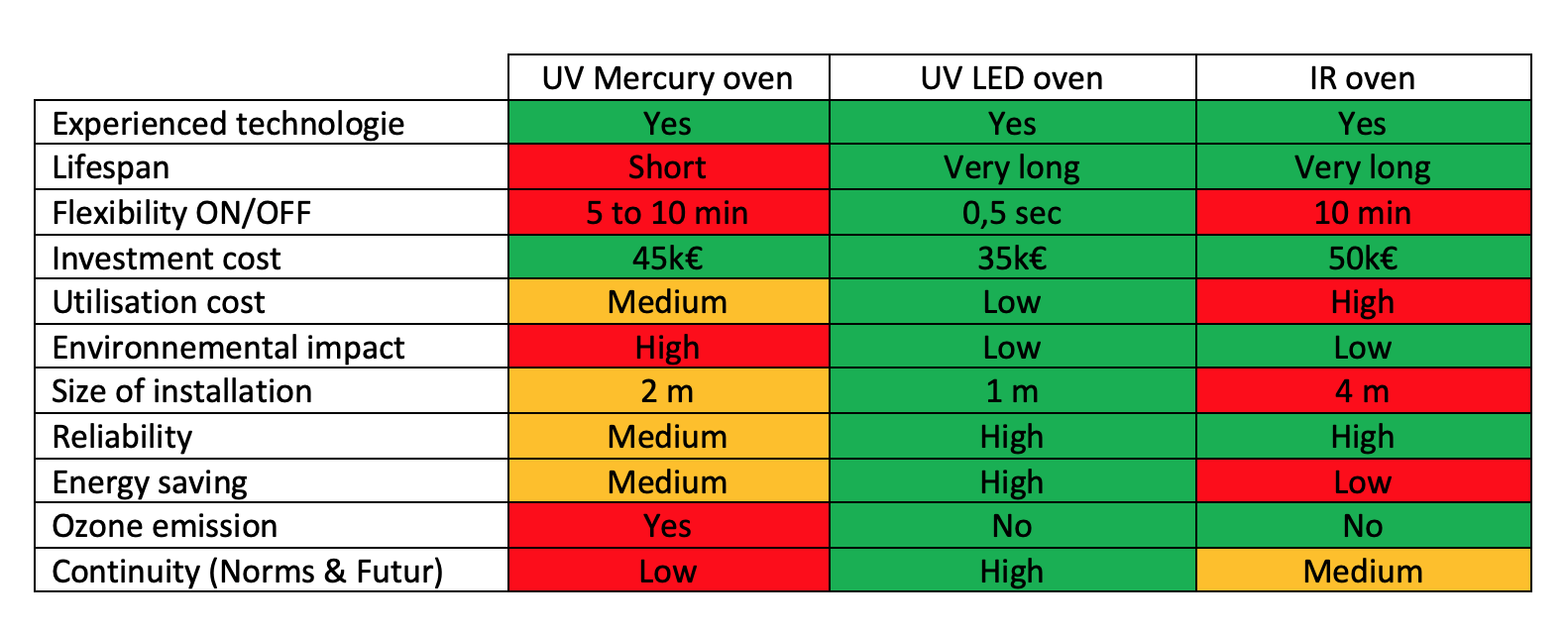 The price of a mercury lamp is rather attractive (a few hundred euros), but this system requires a lot of maintenance and users must have in mind that it is necessary to replace the lamps quite frequently. REACH standards and other environmental standards that do not promote the sustainability of this technology must also be considered. In addition, the integration of a mercury lamp into an equipment requires an extraction system and temperature management that can be quickly binding.